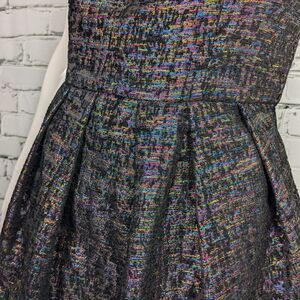 Perfect for holiday parties, it has a thick sort of wool feel and colored metallic thread all over. The back is dipped low, the skirt kind of is a bubble style.