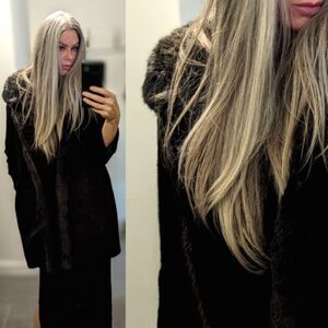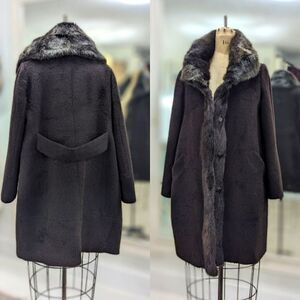 Chocolate mink shawl collar & front closure. The body of the coat is a textured alpaca. Front slash pockets. Faux belt through back. 3/4 length sleeve. Oversized snap center front closure.