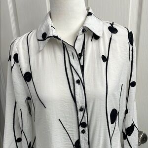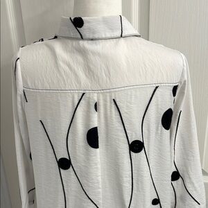 This top showcases a striking black polka dot pattern on a crisp white background, offering a modern and artistic flair. With its 3/4 length sleeves and a high low hemline it provides both comfort and style. The dress shirt collar and button down front is a classic style. Can be dressed up or worn more casual depending on your personal style. Would look great with black or white pants or leggings. In excellent condition, worn only a few times.