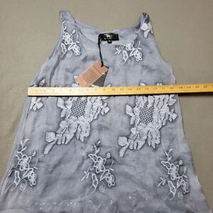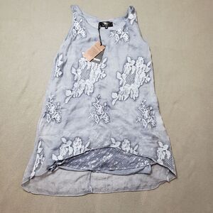 Minkas tunic tank top with lace accents, new with tags. Blue/grey in colour, sleeveless tunic tank, pull over top.