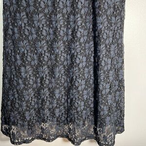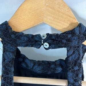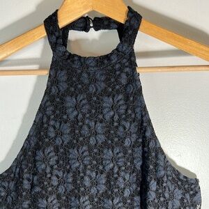 One part cute and two parts sexy, the MinkPink Dancing In the Dark Navy Lace Halter Dress is the ultimate day-to-night dress! A stretchy peach lace overlay falls into a darted swing bodice with a high halter neckline, and two mother-of-pearl buttons at the neck. Open back has two sexy straps at the sides. Fully lined in woven viscose. Self: 50% Polyamide, 40% Cotton, 10% Elastane. Lining: 100% Viscose. Machine Wash Cold. In good condition