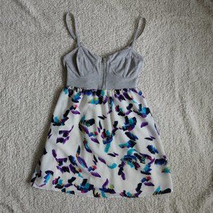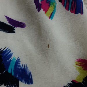 Worn only a couple of times. Please note the small stain (in photos). It's barely noticeable because the pattern is busy with the feathers, but I did want to make note of it!