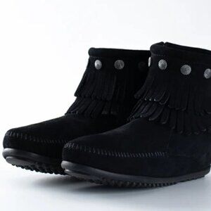 Minnetonka Size 7 Like New Authentic Leather Suede Featuring two layers of signature suede fringe that loops all the way around the ankle. Western-style metal accents. Side zipper opening. Handmade from the highest-quality suede. Limited Edition. Lightly used Edition Style #699 Colour- light black Measurements available upon request No Box no Sleeves No Sacks No Dustbags   #Minnetonka #suede #fringe #ankle #ankle boots #suede-ankle-boots-wirh-fringe