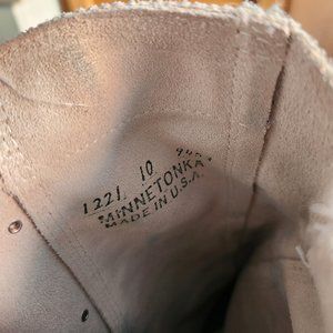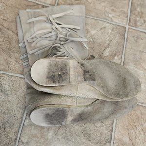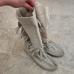 Cream/grey/stone colour suede boots with fringe and a cute slouch. Fair condition, I've had them for ages, still lots of life though.