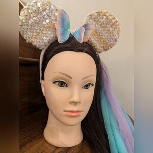 Adorable Disney Minnie Mouse headband with butterfly detail. Features long, colorful tulle ribbons, sequins and embroidered lace. Perfect for costumes or fun occasions.