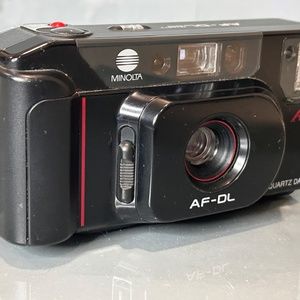 The Minolta AF-DL or Minolta Freedom DL was one of the early easy-to-use all-automatic compact cameras for 35mm film. The on/off-switch opens and shuts the two-part lens cover. A red button allows switching the lens from wide-angle focus to standard focus and vice versa.