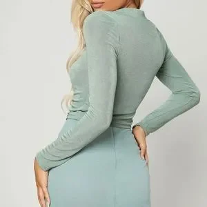 BRAND NEW!!! This top is stretchy and ruched. There is a hit of of glitter in the fabric which is a nice touch. Long sleeves.