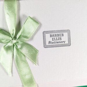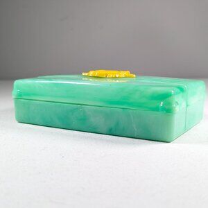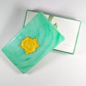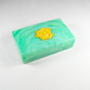 A delightful and colourful mint / grass green box with a bright yellow rose on the lid. Made in Canada. There is wear to the box and a short crack in the middle of a long end, and the stationery is not complete.