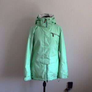 Well-loved but still in good condition! Has a magnetic flap to cover zipper, removable hood, underarm zipper for venting, it's the perfect jacket for the Canadian cold. Has some small stains (not all shown in photos but similar looking) and a broken elastic as shown in photos.
