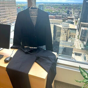 This contemporary and beautifully made matching suit is a cotton wool blend (only damage is missing fabric label on jacket inside) straight wide legged pants size 8 and a beautiful lined blazer. Always in style and this suit is a rare classic.