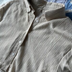 •Stylish beige cropped button-up shirt. Perfect for casual wear.