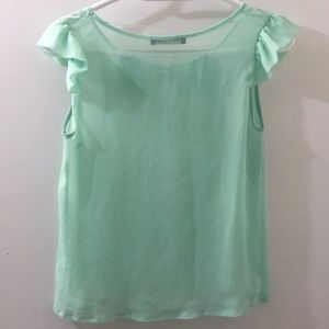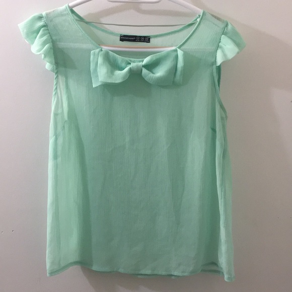 Mint green blouse with bow and flutter sleeves. Very light and airy. Size small. Good condition with some small little threads coming out, took a close up picture to show this.