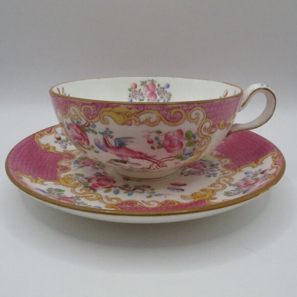 These pieces are crafted from fine bone china, known for its translucence, strength, and delicate appearance. The teacup measures around 1.75" in height with a 4" diameter, while the saucer is approximately 5.75" in diameter. The "Cockatrice" pattern is often referred to as "Bird of Paradise" due to its exotic bird imagery. The backstamp suggests a time period of manufacture of 1912-1950