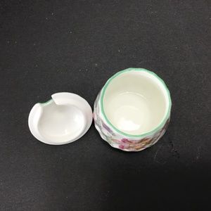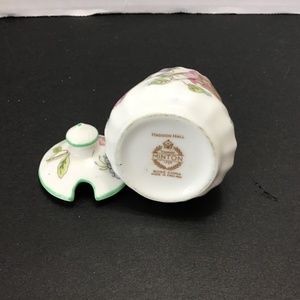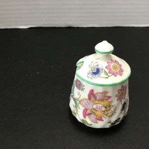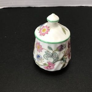 Approx. measurements - 3” H with lid. 2” diameter. Good vintage condition. Bright colours. No chips or cracks. Base mark- Haddon Hall Minton 1793. Bone china . Made in England.
