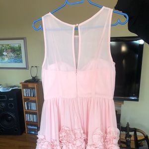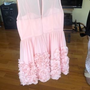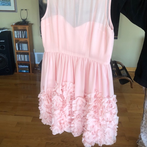 Blush coloured dress with floral textured bottom. Sheer top with spaghetti strap lining underneath. Lining is 100% polyester, dress itself is 95% polyester and 5% spandex. Worn once as a Bridesmaid dress. Size medium.