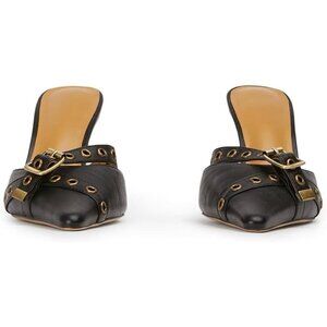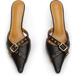 Unique Buckle and Grommet Accents: The standout buckle design and gold-tone grommets give these kitten heels a glamorous and bold aesthetic, making them a statement piece for any outfit