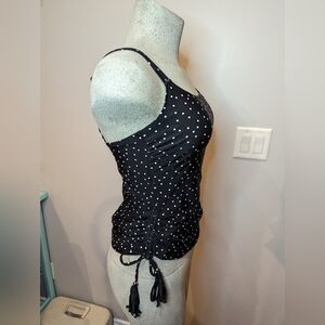 Miraclesuit tankini top, with Bust and Tummy Control. Size S. Black and white polkadot, ruched adjustable sides, with tassel ties lightly padded cups with inner bust control bra, adjustable straps. Excellent quality, worn once.
