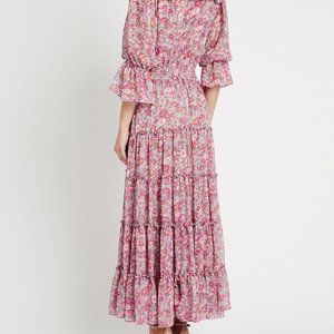 The Hermosa dress is cut from pink floral chiffon with hints of lilac throughout. Featuring a button shirt bodice with ruffle trimmed chest pockets and a sweet ruffle detail at the back placket. Elbow length semi-sheer sleeves are finished with an elastic ruffle trimmed cover. A covered elasticated waist leads into a flowing long skirt with tiered delicate ruffle details. This versatile style is the epitome of sophistication and can be paired with everything from flats to strappy heels.