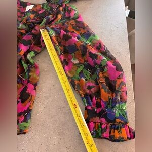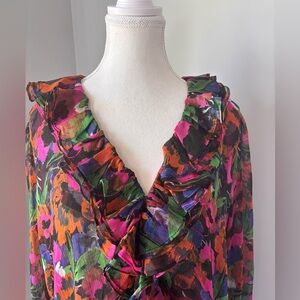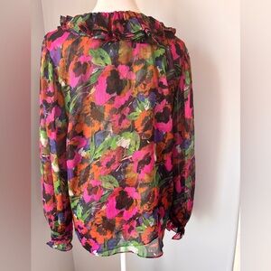 Brighten your wardrobe with this colorful floral sheer blouse. Features ruffled details and a lively pattern.