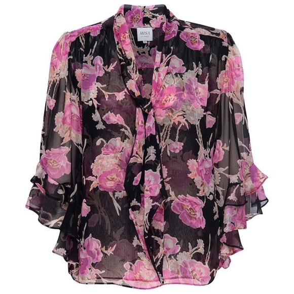 Statement-making chic, the Gigi top is cut from a gorgeous floral chiffon. Three-quarter sleeves with ruffle trim and a v neckline with neck-tie that can be worn loose and undone for a laid back look or tied in a bow. This workday to weekend look can be paired with black pants or denim for a casual look.