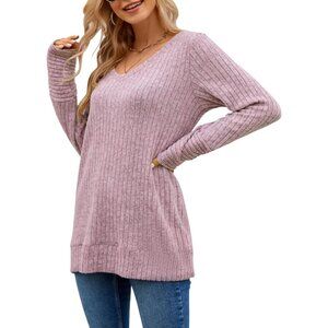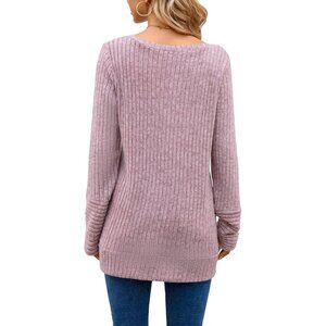 Misfay Women Light Pink Casual Long Sleeve V Neck Shirts Solid Color Sweaters