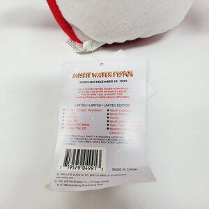 Adorable Misfit Water Pistol Plush from the Rudolph the Red-Nosed Reindeer – Misfit Toys collection (CVS exclusive). This whimsical plush is designed like a red-and-white cartoon-style water pistol, featuring long dangling arms and legs, shiny black eyes, and a slightly worried expression. It also has a soft plush “water hose” on top for added character.