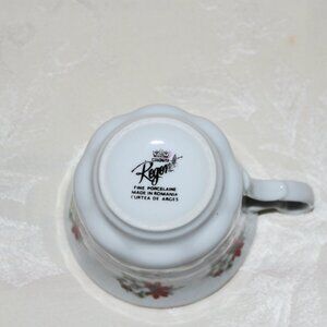From Crown Regent, the fine porcelain teacup has a gold rim and is in excellent condition without any chips, cracks, or crazing. Height is 2 3/4" and width to the handle is 4 1/4".