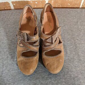 Mottled tan leather wedge heels trimmed in taupe suede with adorable taupe bows on the straps.