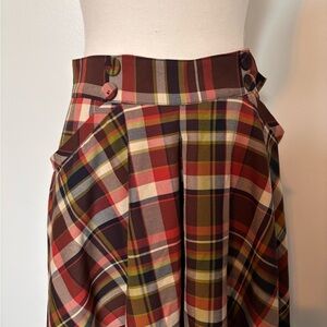 Channel vintage sophistication with this plaid swing skirt features a vibrant mix of colors, perfect for any occasion. Skirt has pockets. The comfortable fit and classic design make it a versatile addition to your wardrobe. Size small. Not much stretch in fabric. Measurements in pictures. Miss Candyfloss is a Brand from Sweden.