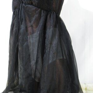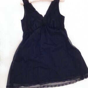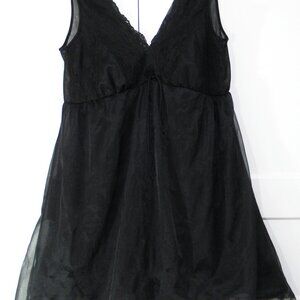 Formed in the 1920s in St. Louis, Miss Elaine continues to produce beautiful lingerie to this day. This is a rare babydoll from the 60s. Outstanding quality and excellent vintage condition, except that the tag has a rip. Two layers of soft and sheer black nylon, with the most gorgeous lace at the hem and neckline, and an underbust tie which you can use if you want. The size tag is not present, but it measures 20 inches from underarm to underarm. I think it's likely a medium, and would fit anyone with up to a 36 or 37 inch bust. The length is 29 inches from top of strap to lacy hem. Simply adorable and feminine. Note: my panties are not included!