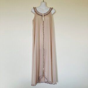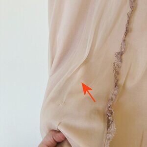 Sleeveless nightgown has hem that curves up slightly in the front center. Pretty ribbon & lace trim. Nightgown has a sheer overlay on top of a more opaque lining. 100% nylon. Tags list sizes as 32/34, loose/over-size fit will fit across small-large ranges - see below for garment measurements. Pre-owned vintage condition: nightgown has a faint discoloration near center lace trim (see photo with red arrow).