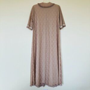 Vintage Miss Glamour robe & nightgown set from the 1960s. Neutral beige color. Robe has short sleeves, collar, ribbon trim along the front edge & sleeve edges. The ends of the ribbon are slightly frayed. Robe has 4 small snap closures along the front, and a single pocket on the right side.
