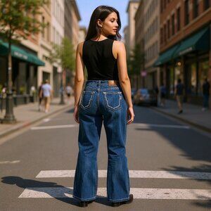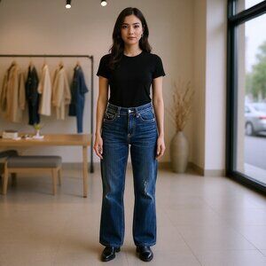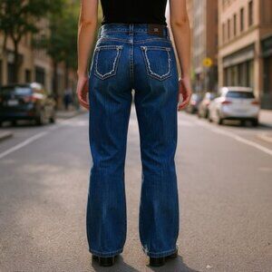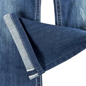 These jeans present a classic boot cut design, enhanced by a stylish distressed finish. The indigo selvedge denim provides a touch of premium quality and durability. Ideal for adding a unique edge to any outfit, these jeans feature jeweled pockets, a mid-rise, and a stretch cotton blend.
