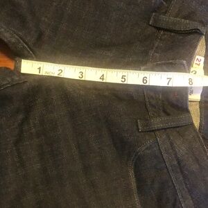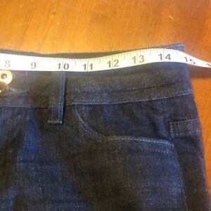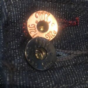Stylish boot cut jeans by Miss Me. Dark blue denim with red stitching accents. Features back pockets with button details.