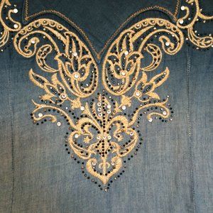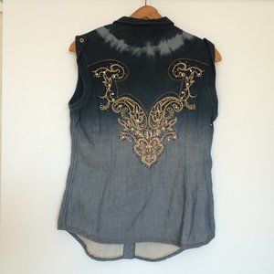 Miss Me Womens Sleeveless Embroidered Blouse Medium Blue Rhinestones Pearl Snap