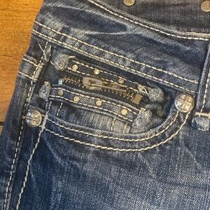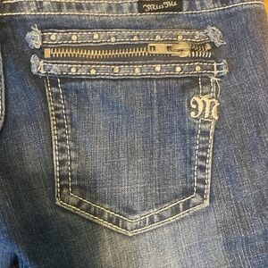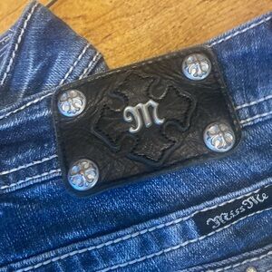 Chic blue denim with black leather detail. Stylish and versatile. Great condition Size 30 33” inseam