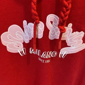 Stylish red hoodie dress with Miss Sixty Milano logo. Features short sleeves and a drawstring hood. Perfect for casual outings.