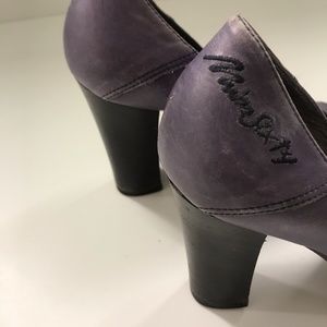 Leather oxford style shoe with 4" wood tone thick heel. Vintage look, rounded toe with striped leather detail, overall in really good condition! European size 39 fits size 9 foot.