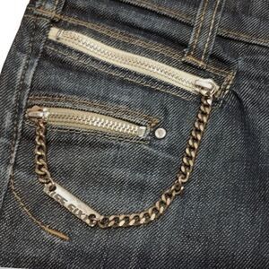 Sweet Y2K Miss. Sixty Low Rise Zipper Jeans. In A Dark Wash, And Slim Fit, Dark Navy Blue Leather Zipper Pull on the Left Front Angled Pocket. On The Right, Double Angled Pockets With Bronze Attaching Chain Holding A Miss. Sixty Bronze Tag. Bronze Logo Back Pocket, With Signature Embroidered Back Pockets. These Are In Excellent Condition, Light Wear, No Flaws.