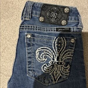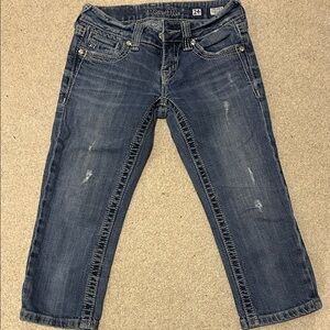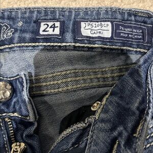 Size 24 miss me Capri’s in used condition one of the leather screw on patch is missing other than that in great condition measurements provided in pictures