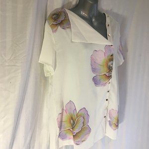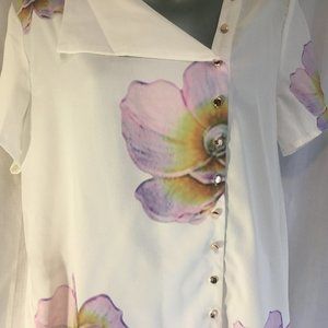 MissLook Womens Button Floral Print Light Blouse Top Sz Med White Floral Flower