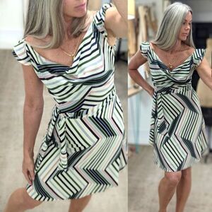 Geometric Viscose georgette, feels like silk. Coconut lime background with navy, olive, purple, dusty pink & grey.