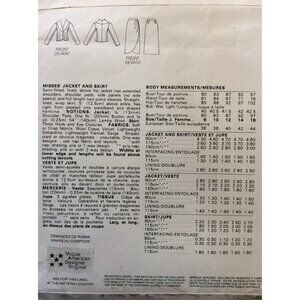 Misses' Jacket and Skirt. Semi-fitted, lined, above hip jacket has extended shoulders, shoulder pads, side panels (no side seams) and full length two-piece sleeves. Straight, lined, wrap skirt, 5" above ankle, has right front pleated into waistband and shaped hemline.