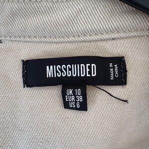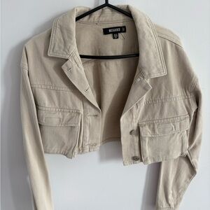 Chic beige jean jacket. Cropped fit with button accents. Perfect for everyday style.