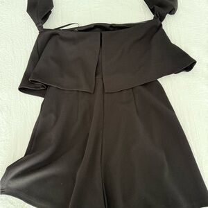 Stylish black romper. Features a layered top design. Perfect for any occasion.