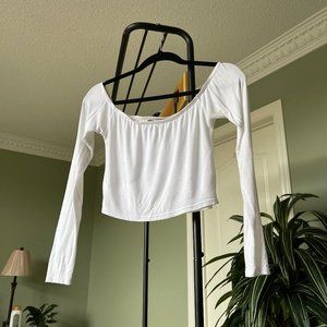 This off-the-shoulder long sleeve top is extremely flattering to the female figure. It cinches in all the right places and is cropped to pair with any high-waisted pants, skirts, etc.
