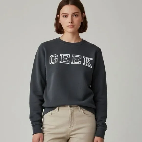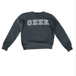 Very preloved "geek" black cotton sweater with overall fade from washing and small pile from washing. See close up direct light pic for detail. Structurally fine. If you like an aged look then it has plenty of gas left in the tank. Size Small-Medium.