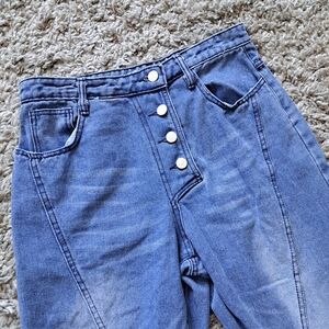 Misslook | Blue button up fly straight leg women's jean with styled fade. women's size medium