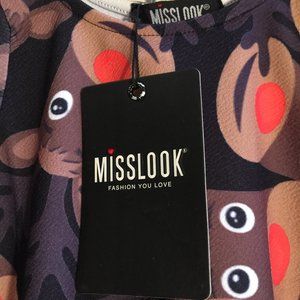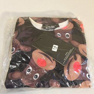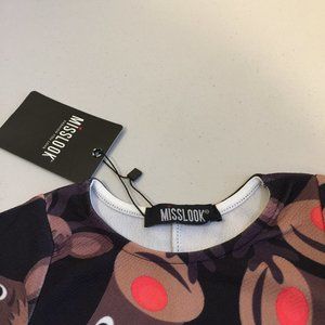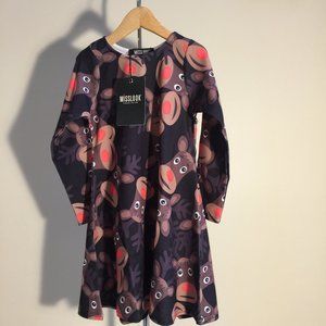 Misslook Girls Dress Red Nosed Rudolph Reindeer Christmas Holiday Winter theme Size 7-8 years. Fun all over reindeer motif. Machine washable. 95% polyester and 5% elastane. Made in U.K. New with Tags. From a non-smoking and pet free home. Great for Christmas Pictures or holiday parties.