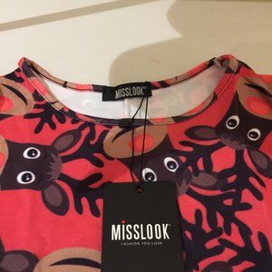 Misslook Ladies Holiday Christmas Reindeer theme tunic long sleeve longer length top Size XL. New with tags. 95% polyester and 5% elastane. Machine washable. Made in U.K. Great to wear with leggings. Flat lay measurements: pit to pit 20" and length of back from neck to bottom hem 33".